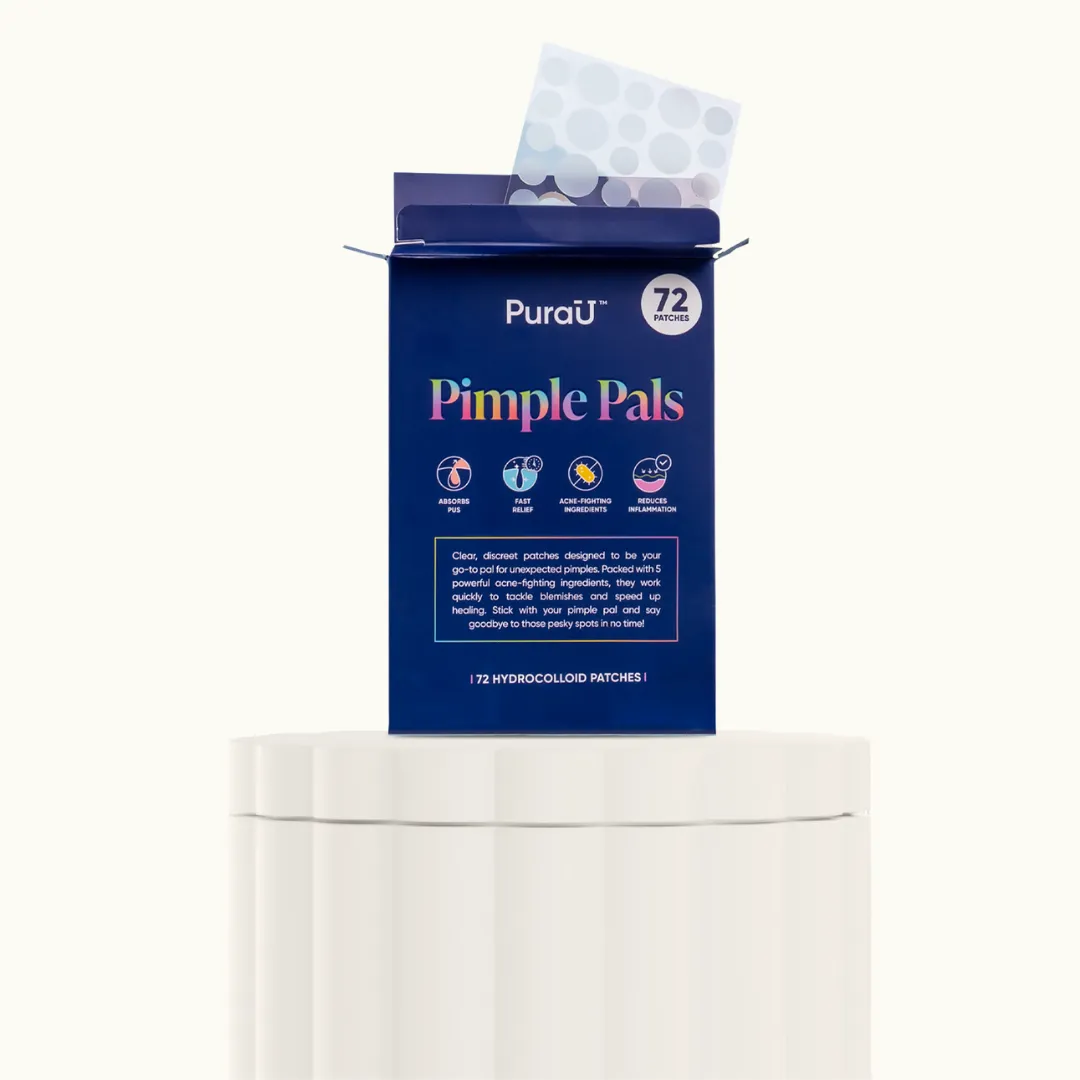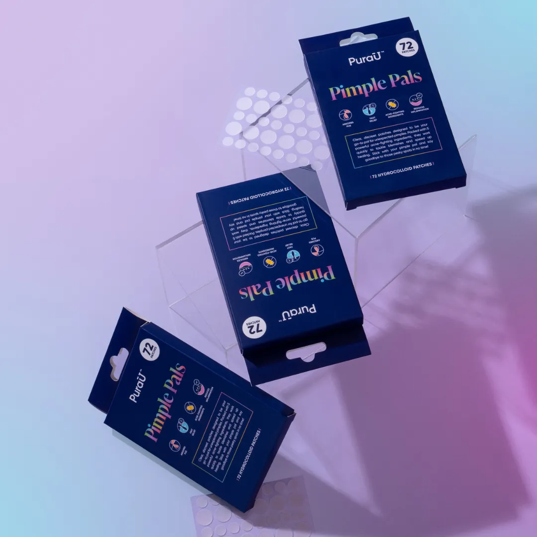 Box of hydrocolloid pimple patches labeled 'Pimple Pals' with 72 patches.